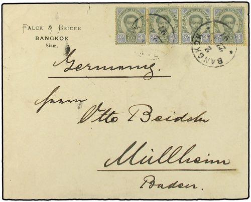 1897 Cover to GERMANY, franked with strip of four 3 a. green and blue (SG 13), all tied by BANGKOK-2 cds. Reverse shows MULLHEIM arrival datestamp. A fine and colorful cover, with very scarce franking.