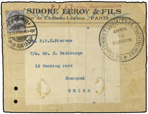 1909 Cover to SHANGHAI franked by single 1899 10 a. ultramarine tied by BANGKOK-2 cds, large cachet at right MESSAGERIES FLUVIAL DE COCHIN CHINE*AGENCE DE BANGKOK and VICTORIA-HONG KONG cds on reverse with British PO SHANGHAI arrival cds on reverse of unusual and interesting cover. Scott. 84.