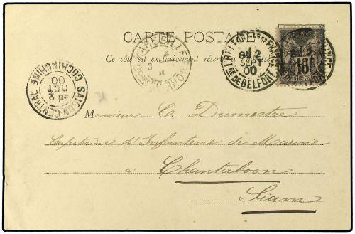 1900 FRENCH OCCUPATION. Picture post card from Belfort addressed to the Captain of the Infantry of the Marine at Chantaboon during the French Occupation, bearing 10 cents black (Type Sage Yvert 89) tied by BELFORT double ring with Saigon Central Cochinchine transit. Unusual item of incoming mail.