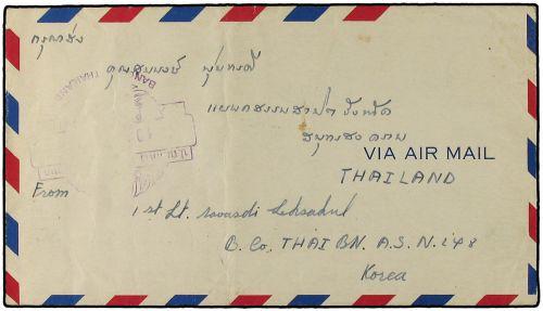 1954 Stampless envelope from a Thai Lieutenant in the KOREAN WAR cancelled by the Siam military cachet in violet sent Air Mail addressed to Bangkok with arrival on reverse. Scarce item of mail rarely offered.