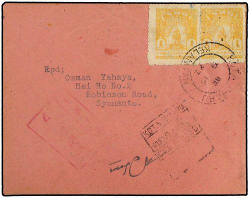 1943 THAI OCCUPATION IN MALAYA. Cover to SYONANTO, franked by two 1 c. yellow General Issue (SG TM1), tied by KOTA BHARU/KELANTAN cds. Front shows violet censor chop, plus bilingual KOTA BHARU censor in black. An extremely scarce multiple usage of the 1 c. stamp.