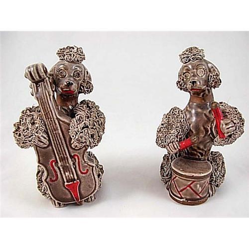 A pair of very hard to find vintage 3 3/4" tall made in Japan Thames #52/288 ceramic brown spaghetti poodle figurines in excellent condition with no chips, cracks, or repairs noted. Both are playing a musical instrument (chello & drums), and both retain their original paper tags on the bottoms. Add these great highly sought after poodle figurines to your collection!