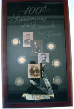 A NICE WOODEN SHADOW BOX WITH KNIFE AND FOUR 2009 LINCOLN CENTS, 1909 LINCOLN CENT AND A 1909 INDIAN CENT, WITH ALSO REPLICA OLD TIME PICTURES OF LINCOLN,WITH MINIATURE LINCOLN CENT INLAY IN THE HANDLE ESTIMATE, $200.00 TO $225.00 SILVERTOWNE AUCTIONS SHIPS ITEMS IN ONE OR TWO BUSINESS DAYS UPON RECEIVING PAYMENT FOR LOTS WON
