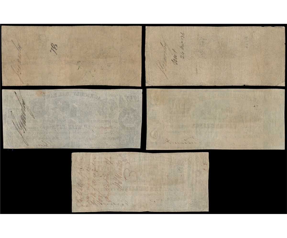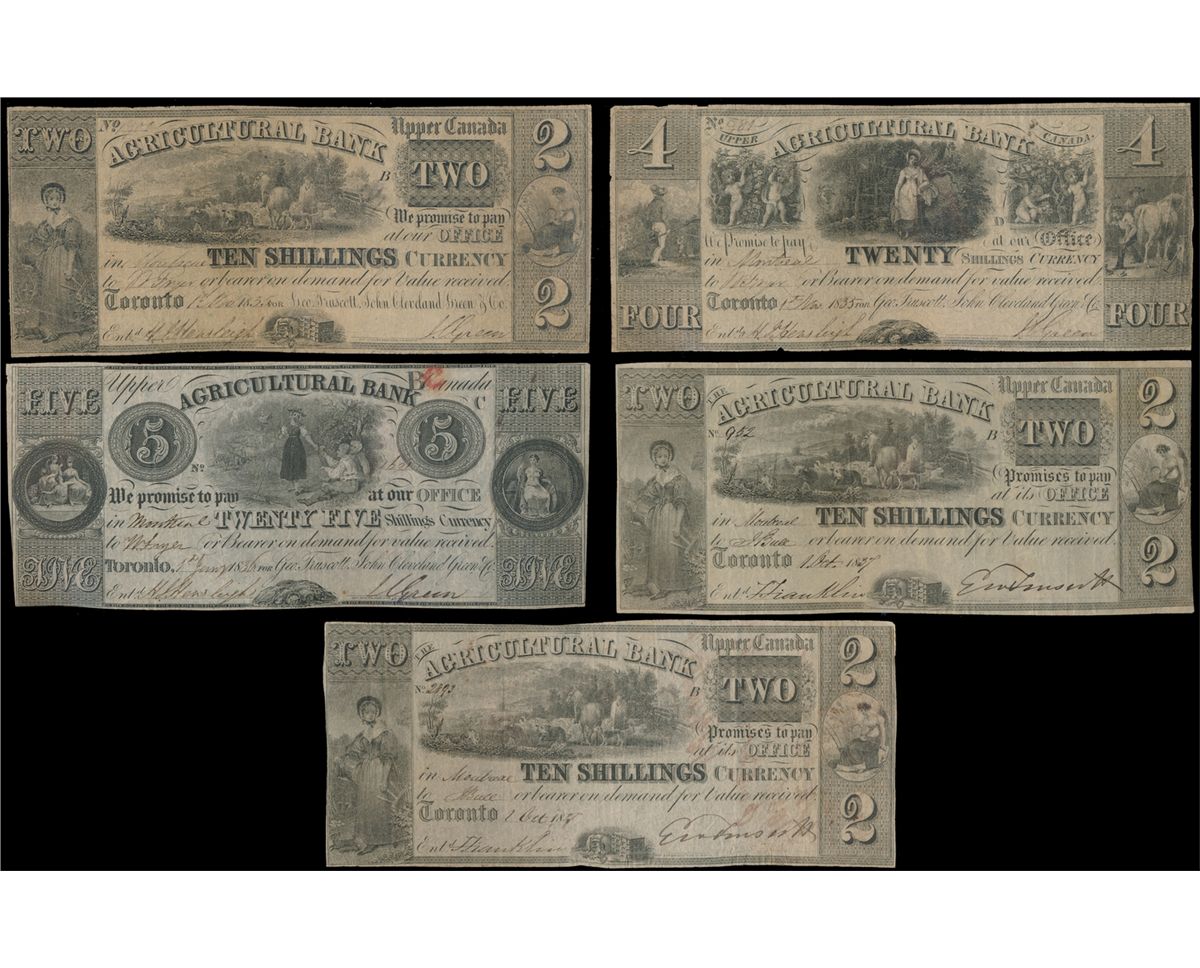 THE AGRICULTURAL BANK. (Toronto). $2.00. (10 Shillings). 1 Oct., 1837. CH-20-12-04-04. No. 952/B. Very Fine; $2.00. (10 Shillings). 1 Oct., 1837. CH-20-12-04-04. No. 2893/B. Fine. Lot of five (5) notes.