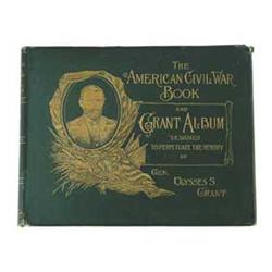 “THE AMERICAN CIVIL WAR BOOK AND GRANT ALBUM DESIGNED TO PERPETUATE THE MEMORY OF GEN. ULYSSES S. GRANT". Large coffee table sized book green cloth covers are decorated in gilt with patriotic motifs and vignette of U.S. Grant published 1894. SIZE: 14" x 17". CONDITION: Chipping at top and bottom of spine and corners of covers. Gilt edges. Contents very good. 4-49359 JS63