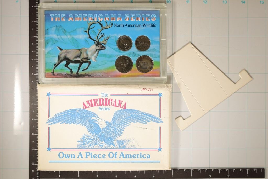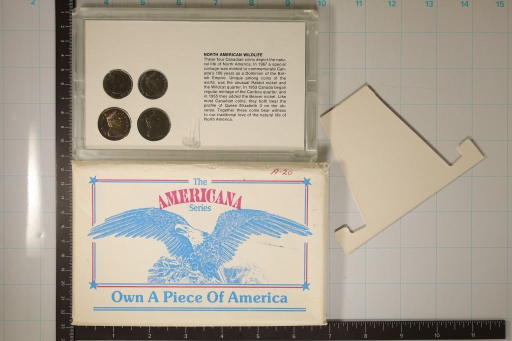 CONTAINS 1962 CANADA 5 CENT, 1967 CANADA 5 CENT, 1967 CANADA 25 CENT SILVER .0937 AND 1974 CANADA 25 CENT IN HARD PALSTIC CASE AND ORIGINAL ENVELOPE