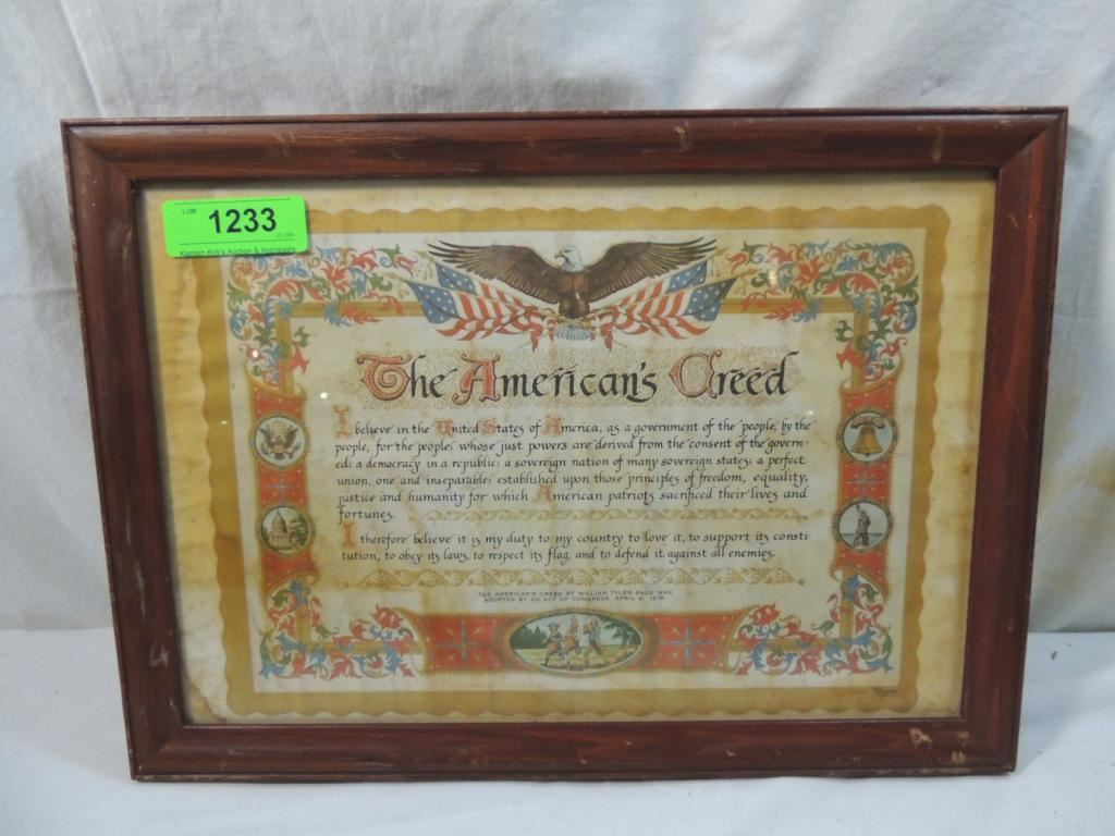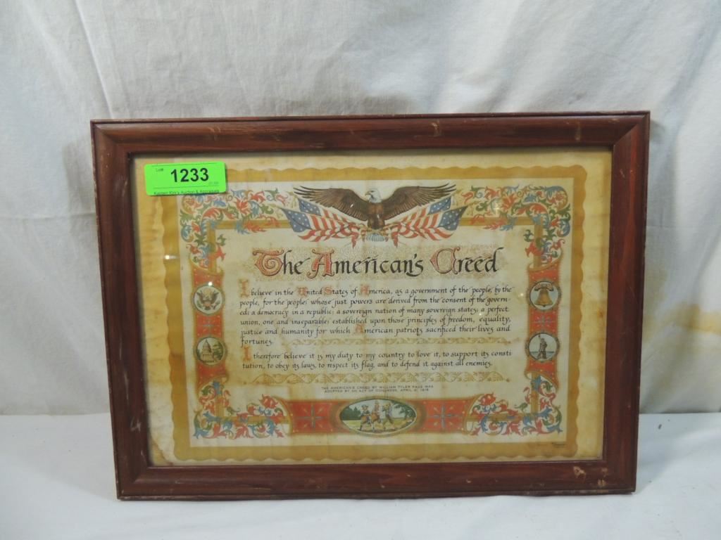 VINTAGE FRAMED THE AMERICANS CREED. 1918 AMERICAN CREED FRAMED DECORATIVE ARTWORK AS SHOWN SEE PHOTO FOR MORE DETAILS.