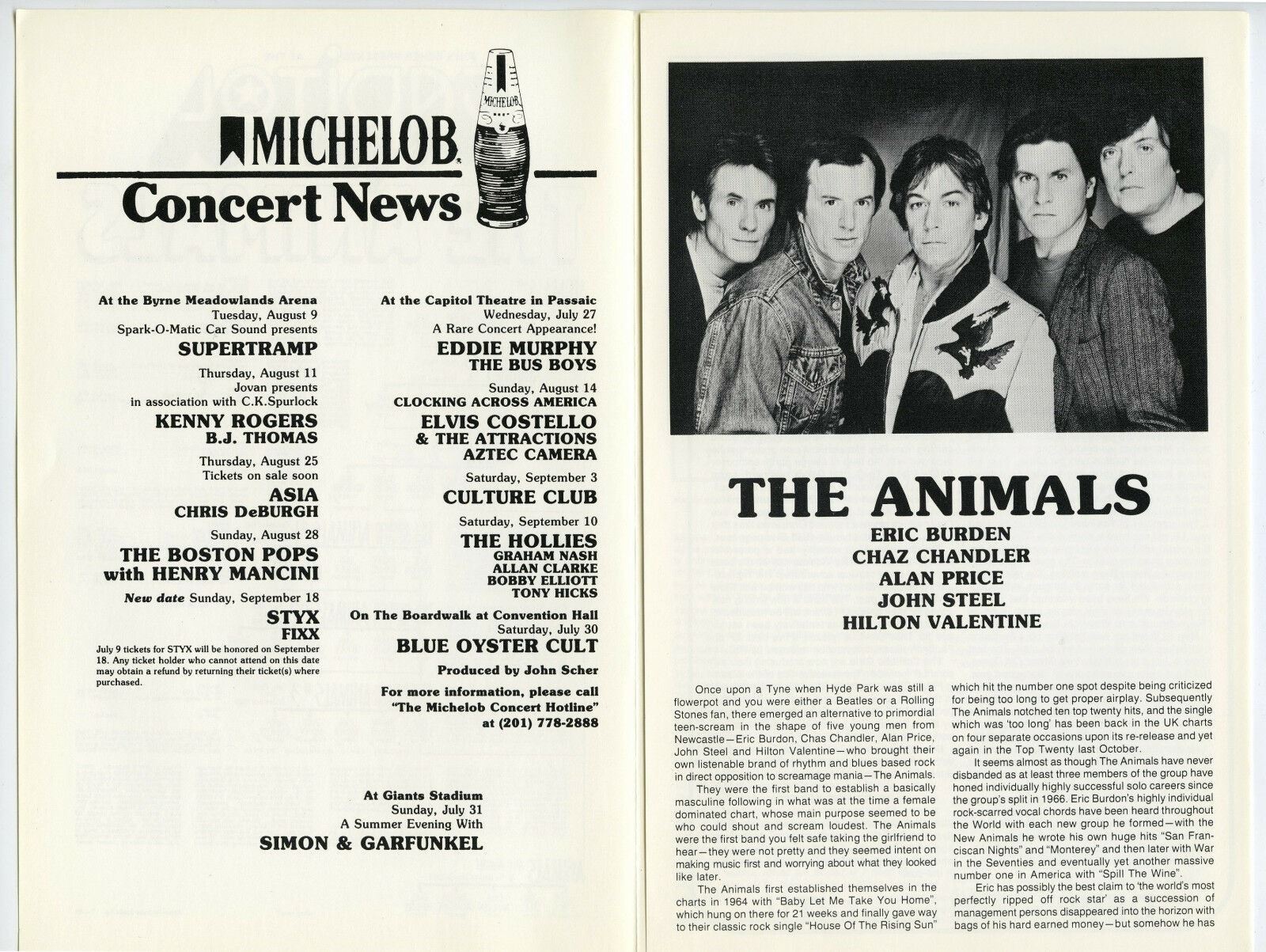 THE ANIMALS (this was a reunion of the original line-up with ERIC BURDON, Chas Chandler, Alan Price, John Steel and Hilton Valentine) appearing July 21, 1983 at the Capitol Theatre in Passaic, New Jersey. This six-page program is a single 16 3/8 x 8 1/2 sheet that was printed and machine folded in thirds, folio, style.