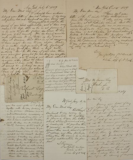 JOHN HUGHES (1797-1864) Irish-born Archbishop of New York serving between 1842 and 1864. Archive of five signed letters, 10pp. total, variously 8vo. or 4to, 1857 - 1860, to Mrs. M. Susan Lay of Washington, D.C. as regards her son, Richard, who sought a commission in the U. S. Army. Hughes plans a visit to Washington and promises to contact President Buchanan on Lay's behalf. Included are copies of letters to Senators Douglas and Seward urging their support for the Senate's confirmation of young Lay's appointment. Though a civilian, Richard Lay indeed secured a 2nd lieutenant's commission before the Civil War and served until 1870. Included are two postal covers pertaining to this correspondence. Good to very good.