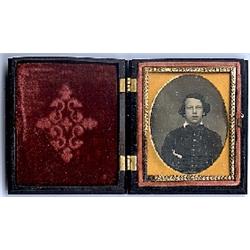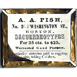 Nice 1/9 plate daguerreotype of a boy [4-]. Behind is a card for A. A. Fish, Daguerreotypes, No. 228 (was No. 2 but change added in pencil) Washington St. Boston. Case is flawless