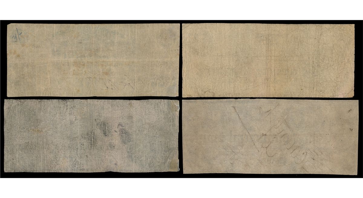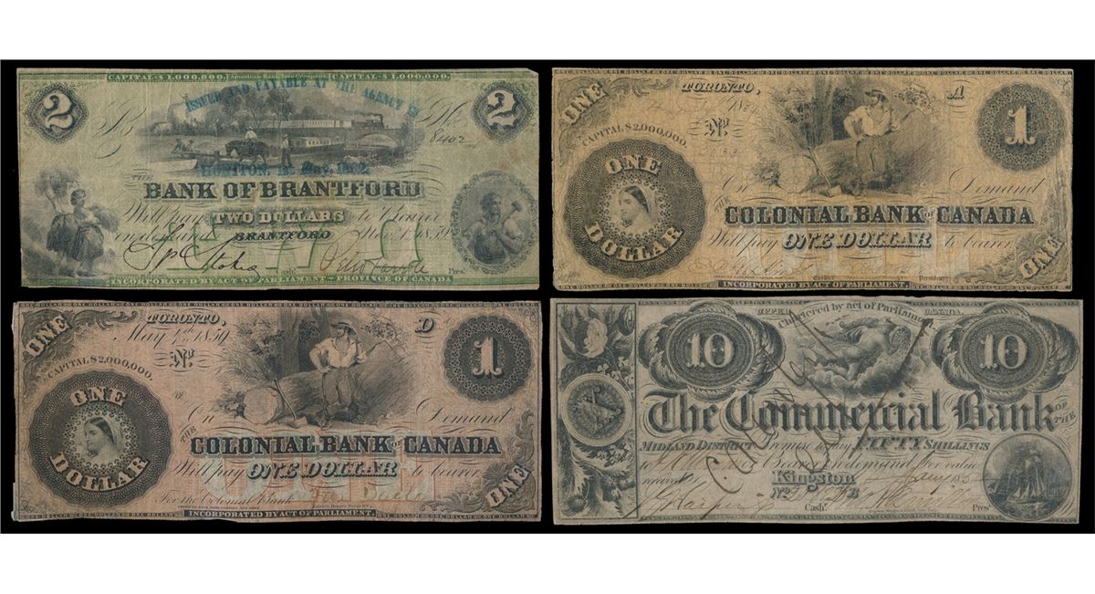 THE BANK OF BRANTFORD. $2.00. Nov. 1, 1859. Engraved Date. Signed S.P. Stokes/Peter Carroll. Overprinted 'Honiton, 1st. May, 1862" in blue. CH-40-10-04-04a. Green tint. Brantford Issue. No. 8402/B. VF; THE COLONIAL BANK OF CANADA. $1.00. 4 July, 1859. CH-130-10-02-02. No. 2033/A. Signed Hopkins/Moss. Good+; $1.00. May 4, 1859. CH-130-10-04-02. No Serial number. Plate letter 'D'. Spurious signature. VG; THE COMMERCIAL BANK OF THE MIDLAND DISTRICT. $10.00. July 1, 1854. CH-190-22-04C. No. 20872/B. 'Cancelled' written across the face of the note. A contemporay counterfeit. VG. Lot of four (4) notes.