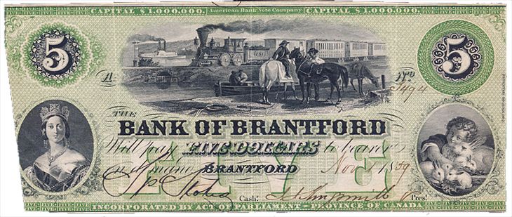 THE BANK OF BRANTFORD. $5.00. Nov. 1, 1859. CH-40-10-02-08a. No. 3494/A. PCGS graded Apparent Very Fine-30. Edge trimmed at left.