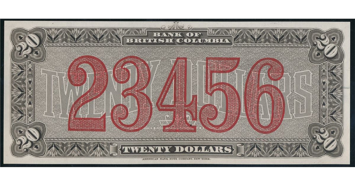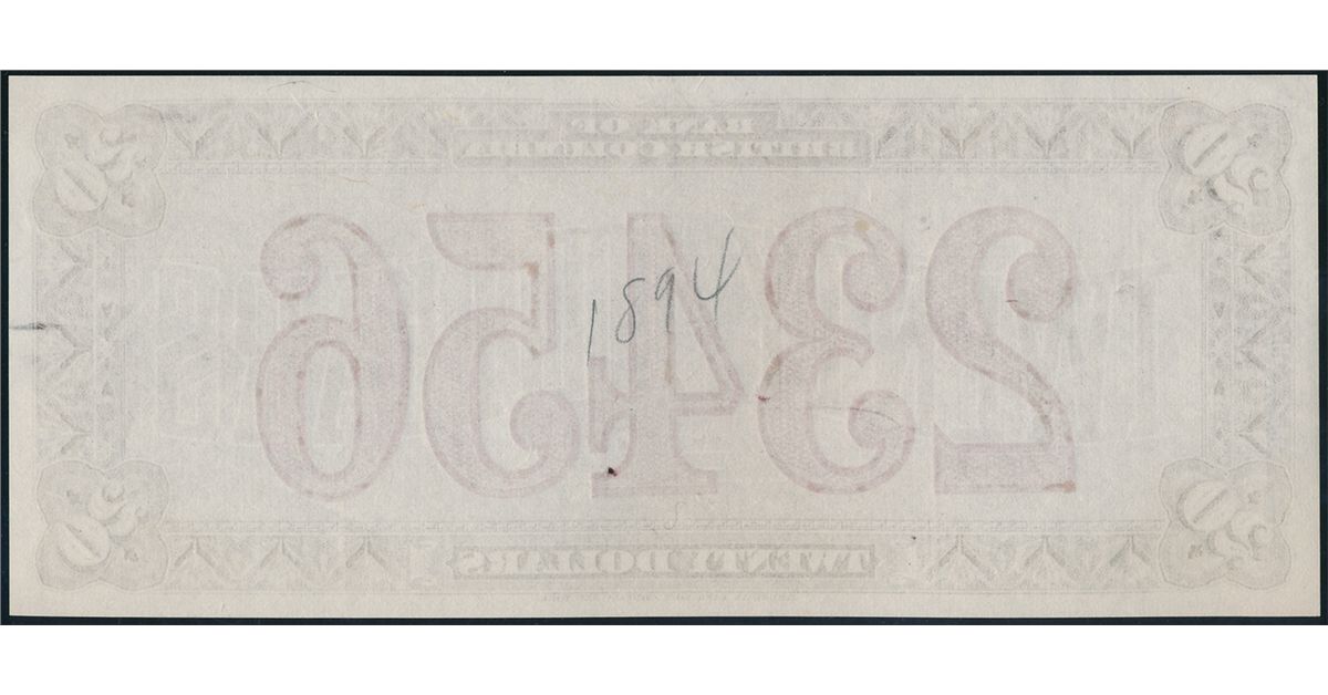 THE BANK OF BRITISH COLUMBIA. $20.00. Jan. 1, 1894. CH-50-16-06BP. A full colour Back Proof on thin paper, with serial number 23456 in red. Pristine.