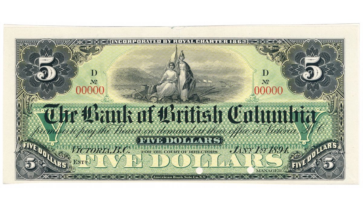 THE BANK OF BRITISH COLUMBIA. $5.00. Jan. 1, 1894. CH-50-16-02P. A full colour Face Proof, on a small card. Serial No. 00000 in red. Series letter 'D'. Pristine.