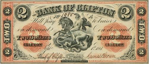 THE BANK OF CLIFTON. $2.00. Sept. 1, 1861. Eng. ‘1’ in date. CH-125-12-12. No. 1985/A. “Sassenberg, etc” stamped on back. AU.
