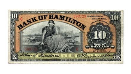 THE BANK OF HAMILTON. $10.00. 1 June, 1914. CH-345-20-16. "C…C" overprinted in red. No. 593729. Good Fine.