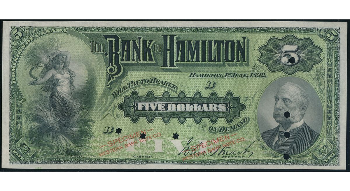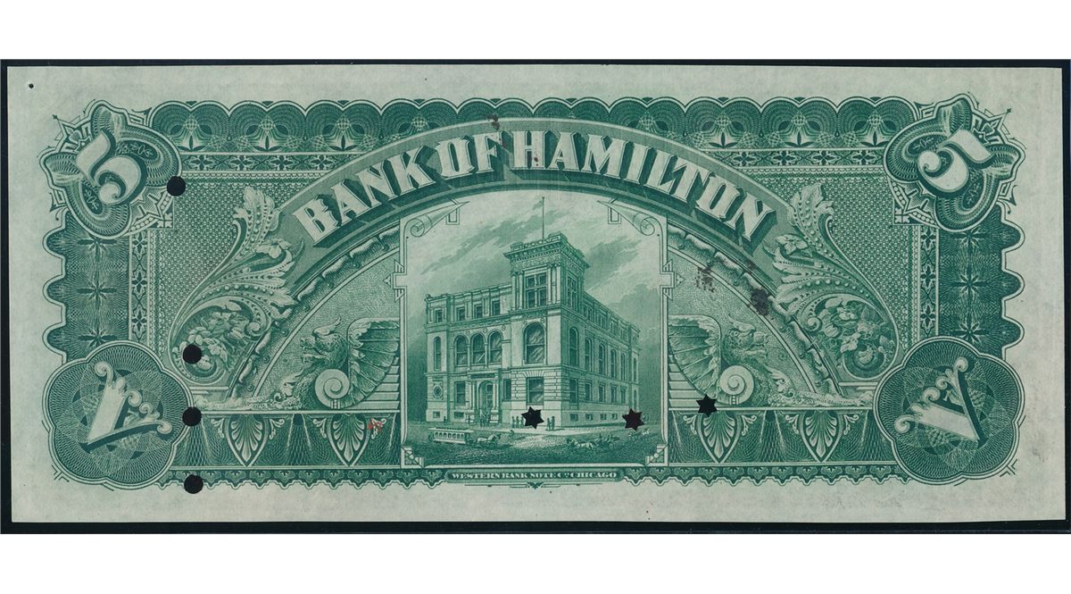 THE BANK OF HAMILTON. $5.00. June 1, 1892. CH-345-16-02S. 'Cashier' at bottom left. No serial number. Stamped 'Specimen' in red. Three star punches at signature area. Four circular punches at the right. Unc.