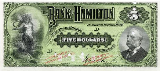 THE BANK OF HAMILTON. $5.00. June 1, 1892. Cashier, left. CH-345-16-02S. A SPECIMEN. Star Cancelled