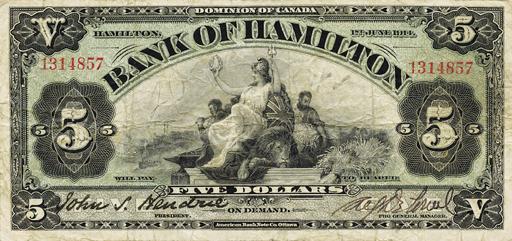 THE BANK OF HAMILTON. $5.00. June 1, 1914. CH-345-20-04. No. 1314857. PMG graded Very Fine-20. A scarce grade, with only one example finer.