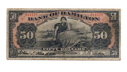 THE BANK OF HAMILTON. $50.00. June 1, 1914. CH-345-20-22. 'C…C' overprinted in red. No. 014128. PMG graded Fine-12.