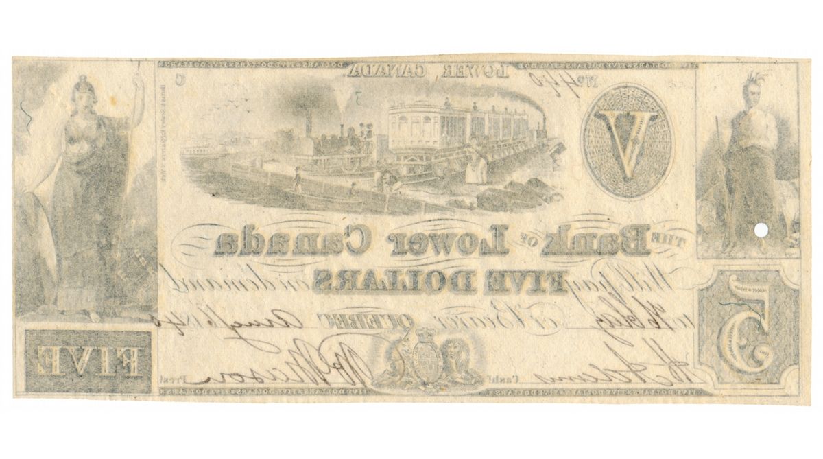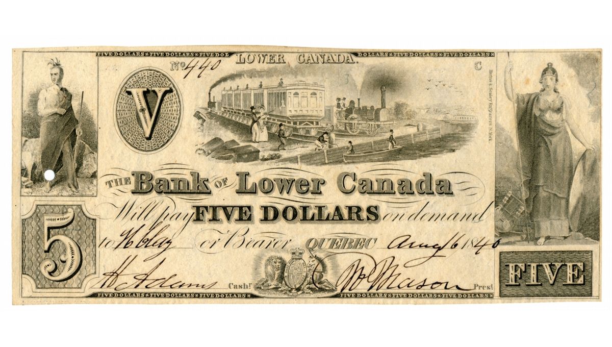 THE BANK OF LOWER CANADA. $5.00. Aug. 6, 1840. CH-410-10-10. No. 440/C. Signed H. Adams/Masson. A fully issued note. Small circular punch at left margin. Choice AU. Ex. Lot #1392. Feb. 22-24, 2007. Torex Auction.