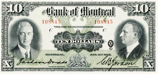 THE BANK OF MONTREAL. $10.00. Jan. 2, 1931. CH-505-58-04. No. 108845/C. Dodds, left. Ex. Knight/Memphis. June 13-15, 2002. Lot #276. Unc.