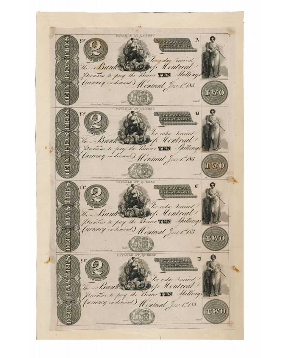 THE BANK OF MONTREAL. $2.00. (10 Shillings). June 1, 183- (1831-35). CH-505-12-04-14P. An uncut sheet of four Face Proofs on thin paper, affixed to a thicker card. Fairman, Drapper and Underwood printing. AU.