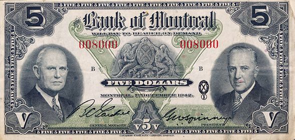 THE BANK OF MONTREAL. $5.00. Dec. 7, 1942. CH-505-64- 02. No. 008000/B. PCGS graded Very Fine-25.