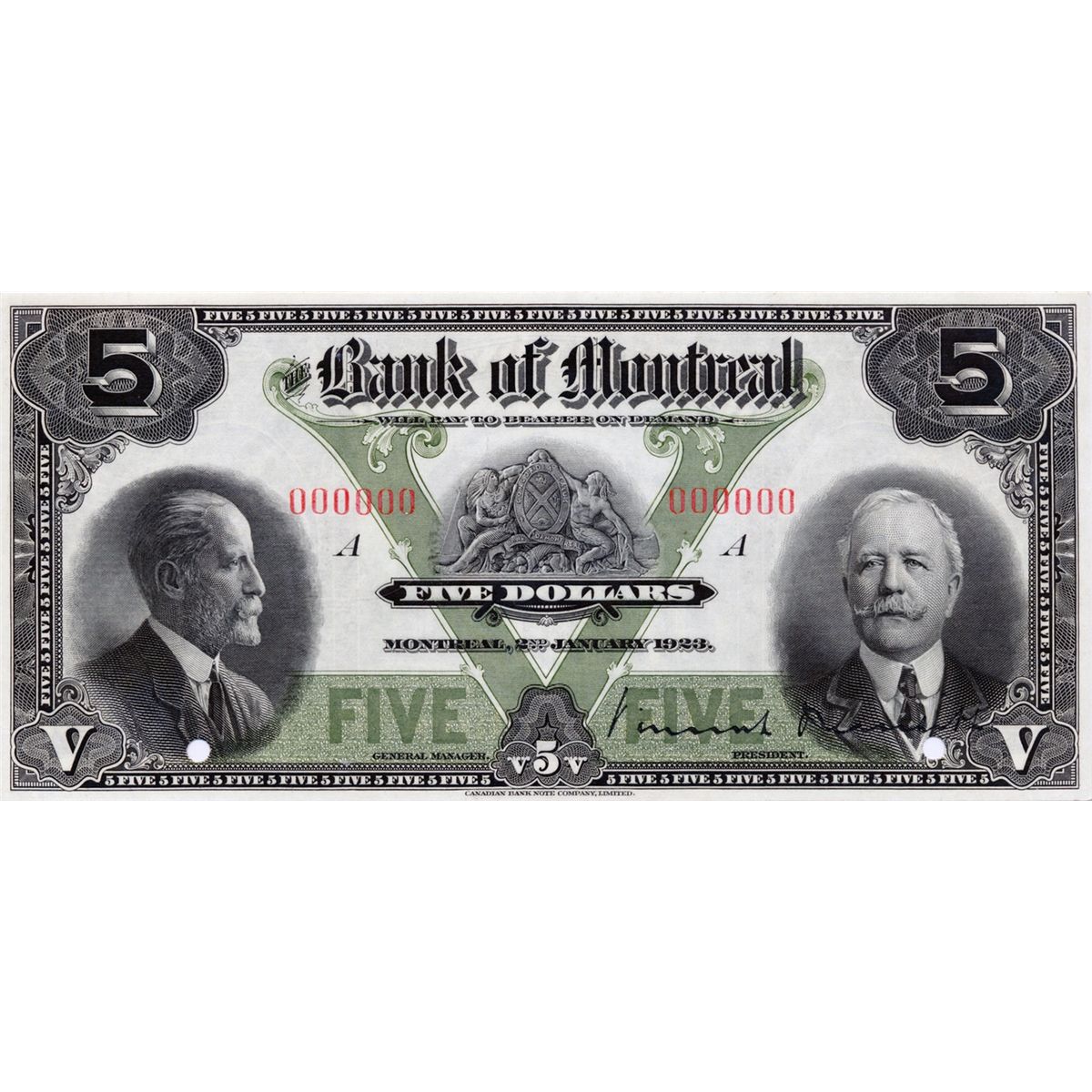 THE BANK OF MONTREAL. $5.00. Jan. 2, 1923. CH-505-56-02S. A Specimen. PCGS CH AU-58PPQ.