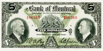 THE BANK OF MONTREAL. $5.00. Jan. 2, 1935. CH-505-60-02. No. 488360/A. Choice AU.