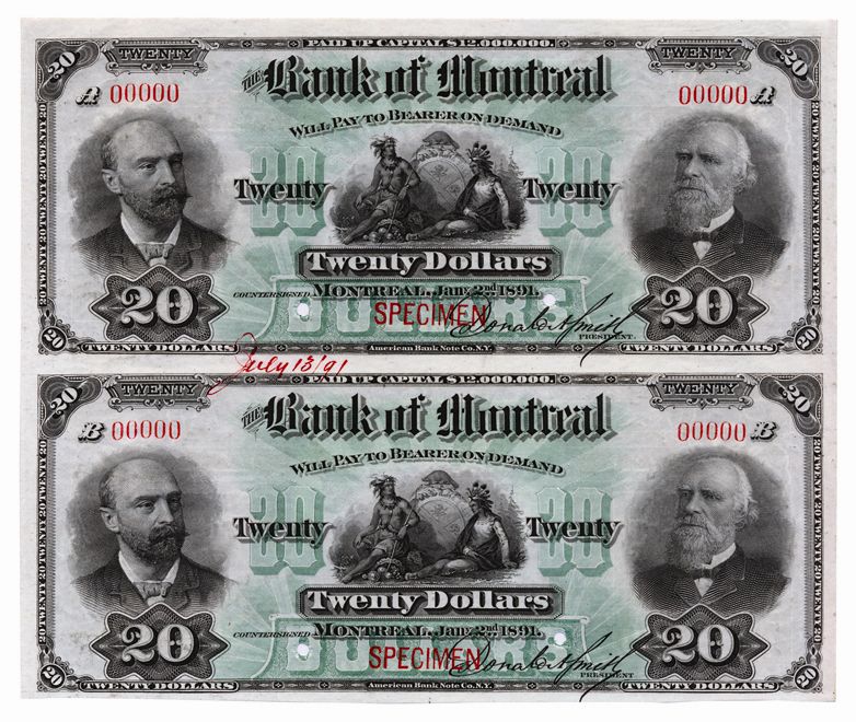 $20.00. Jan. 2, 1891. CH-505-40-06S. An uncut sheet of two (2) Specimen notes. Each with serial No. 00000 in red. Plate letters A, B. Unc. “”July 13, 91’ written in ink in the margin between the notes.
