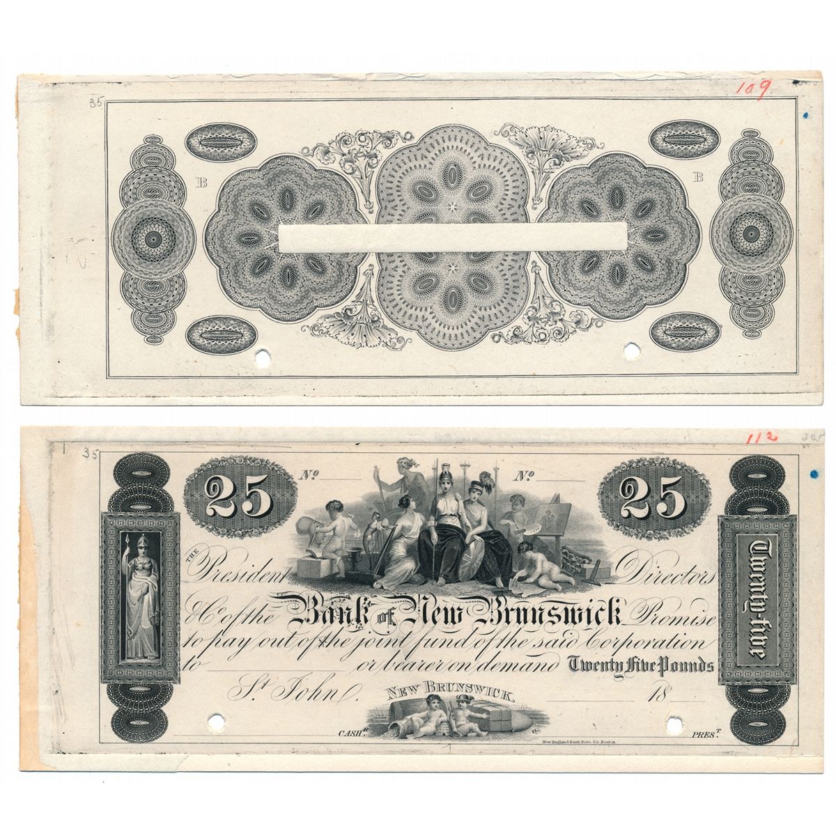 THE BANK OF NEW BRUNSWICK. St. John. Twenty-Five Pounds. Issues of 1838-1859. CH-515-12-60P. A Black and White Face Proof and a Back Proof on cards. Two circular punch holes at signature areas.