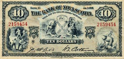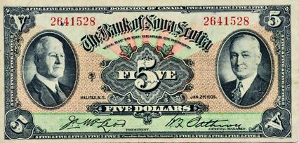 THE BANK OF NOVA SCOTIA. $5.00. Jan. 2, 1935. CH-550-36-02. No. 2641528. About Fine; $10.00. Jan. 2, 1935. CH-550-36-04. No. 2159454. Fine. Lot of two (2) notes.