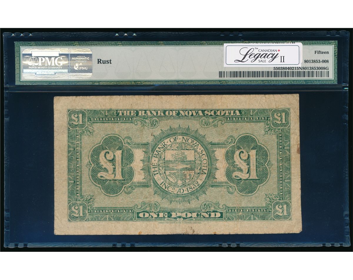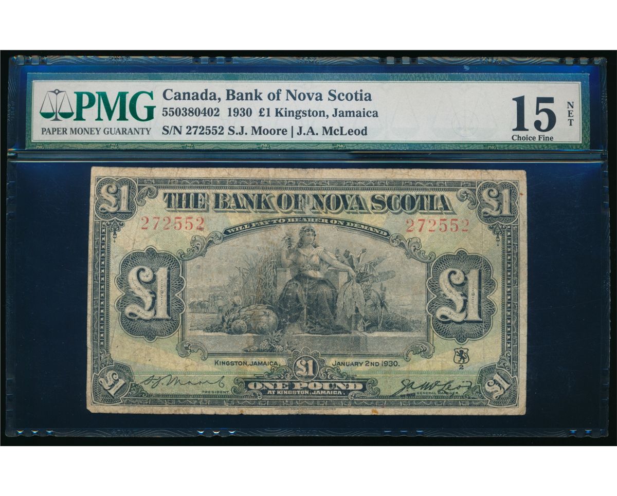 THE BANK OF NOVA SCOTIA. Jamaica At Kingston. £1. January 2nd 1930. CH-550-38-04-02. McLeod-Patterson. No.272552. PMG graded Choice Fine-15 NET. A solid example of this scarce issue, with just a couple of light hints of rust at the margins.