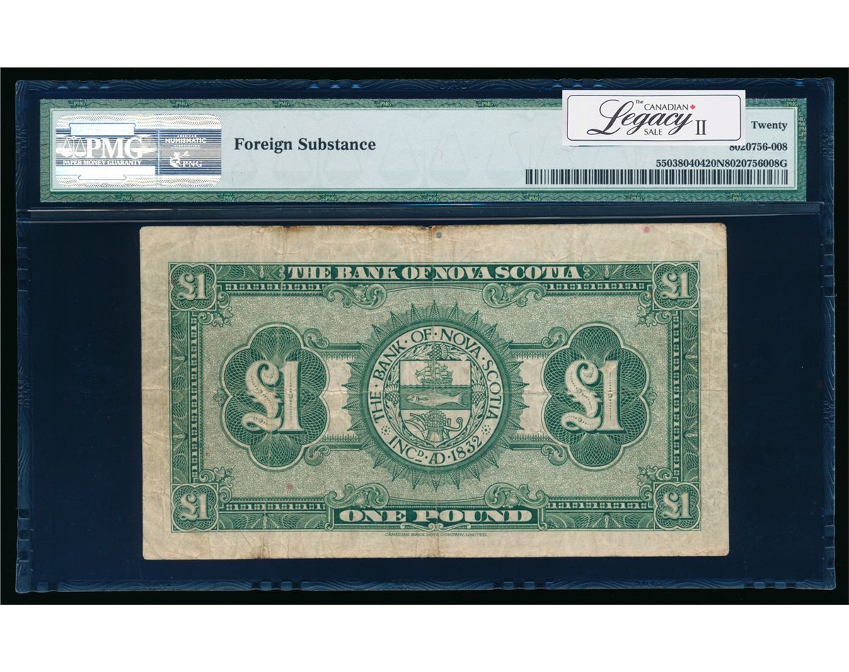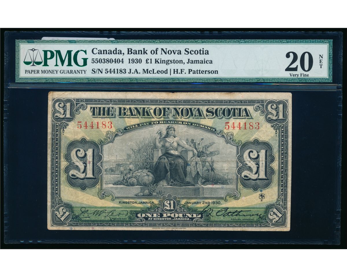 THE BANK OF NOVA SCOTIA. Kingston, Jamaica. £1. January 2nd 1930. CH-550-38-04-04. McLeod-Patterson. No.544183. PMG graded Very Fine-20 NET. An attractive and original mid grade note with no major problems.