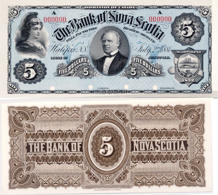 $5.00. July 2, 1881. CH-550-20-06P. Variety two. Full colour Face and Back Proofs. The Face with blue tint on a thin card, the Back with a brown tint on thin paper. Both are pristine. The Face with serial No. 000000/A twice in red.