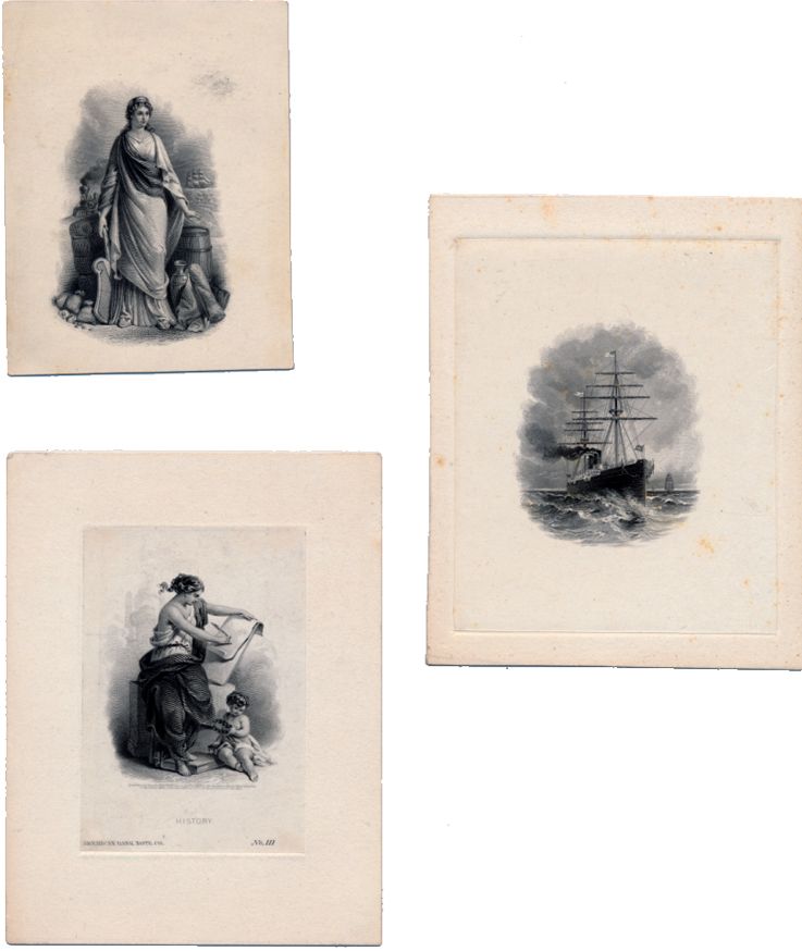 Vignettes. Three small die proof vignettes. 1). Allegorical female writing, child ‘History’. On the left side of the face of the 1897 $20.00 issue. 2). Allegorical female standing. 3). Steamship approaching viewer. Both from the Face of the $5.00 issues of 1898-1908.