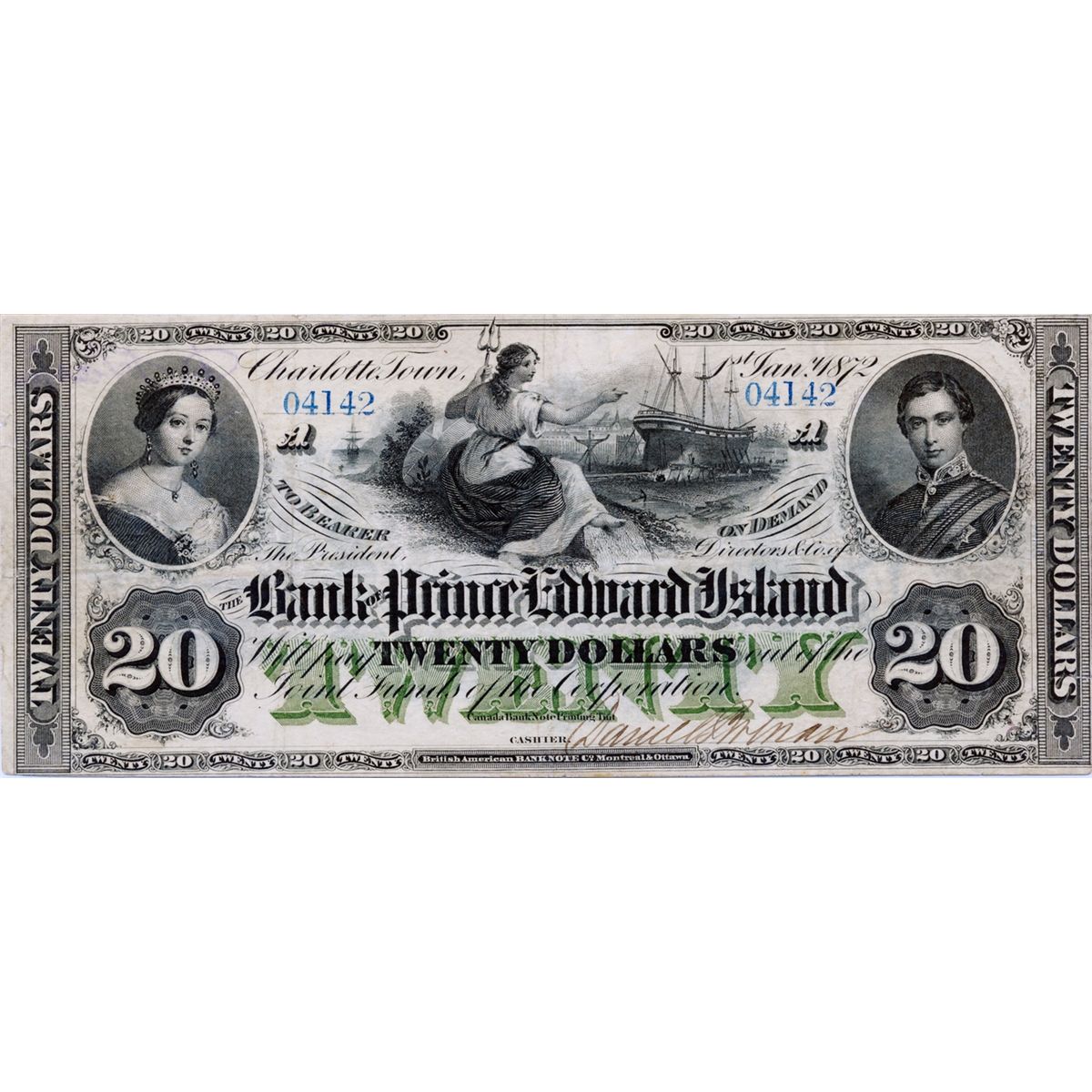 THE BANK OF PRINCE EDWARD ISLAND. $20.00. Jan. 1, 1872. CH-600-12-16R. No. 04142/A. PMG graded Very Fine-25. Only one example graded higher.