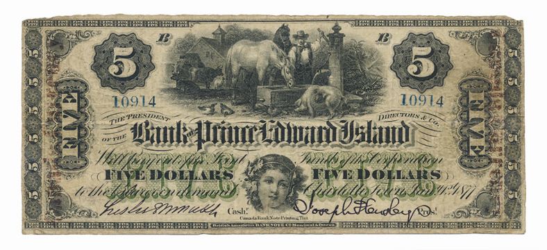 $5.00. Jan. 1, 1877. CH-600-12-12a. No. 10914/B. Signed Leslie S. McNutt/Joseph Hensley. Red ‘CANADA CURRENCY’ Overprint. Unlisted in the 2013. C.P.M.S. registry. Fine.
