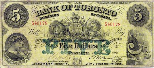 THE BANK OF TORONTO. $5.00. 1 February, 1906. CH-715-22-06. No. 540178/C. A solid Very Good note. This note has sheet number 540178, a 678 sheet intrusion into what should have been the start of the 1911 issue.