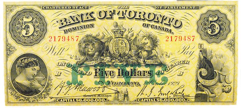 THE BANK OF TORONTO. $5.00. Oct. 1, 1929. CH-715-22- 22. No. 2179487/B. PMG graded Very Fine-25.