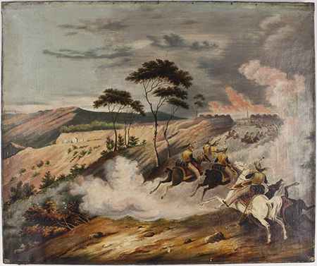 Contemporary oil painting of a Mexican War battle scene, likely the battle of Chapultepec, a rather naive 25" x 30" oil showing American cavalrymen assaulting a Mexican fortress en masse. Quite well executed, showing horsement attacking the fort in waves, with a wounded horse in the foreground. A canvas-maker's stamp on verso reads: Prepared by Edwd. Dechaux New York", dating this painting to the time of the conflict. A few very small chips here and there, else very good condition.