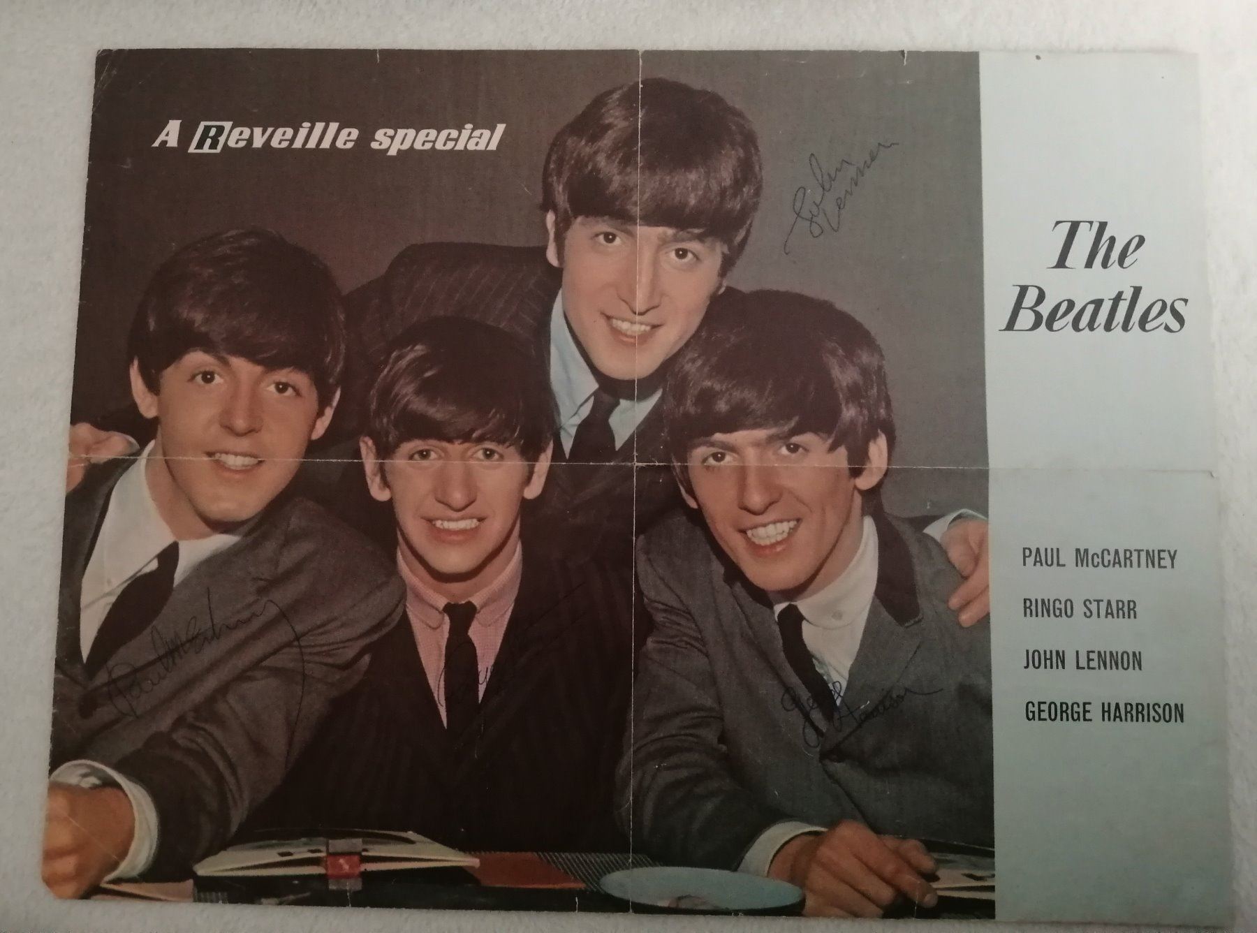 A Beatles Reveille signed poster. Signed by John Lennon, Paul McCartney, George Harrison and Ringo Starr. Various tears in poster. Mounted and framed.