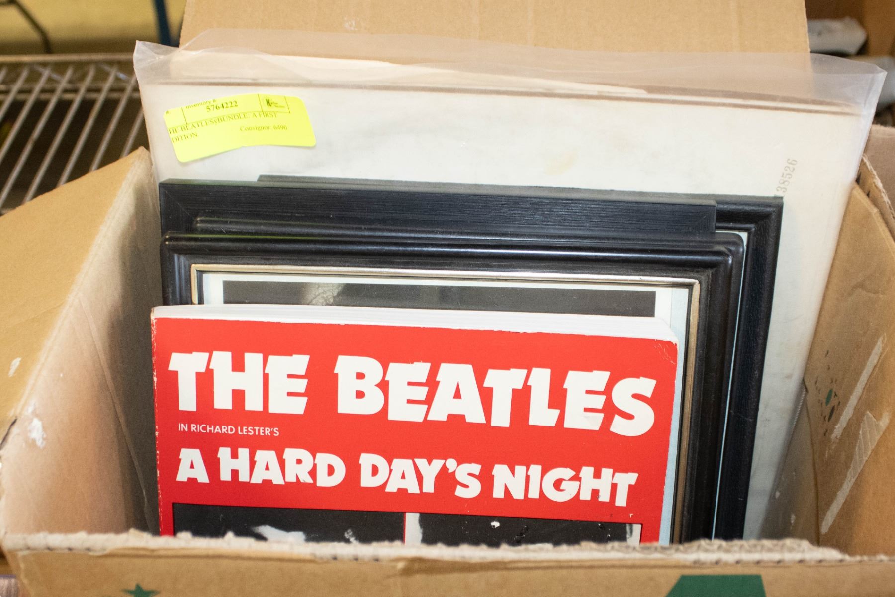 OF PENGUIN'S 1978 "A HARD DAY'S NIGHT" BOOK, A WELL-PRESERVED WHITE ALBUM WITH POSTER INTACT INSIDE, AND FOUR BEATLES PICTURES FROM THE ALBUM ALL FRAMED