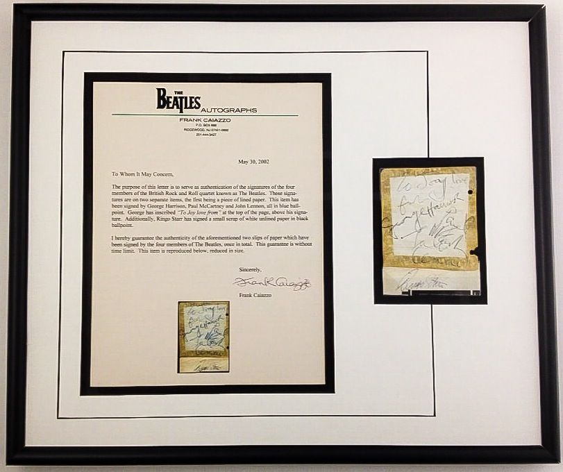 A SET OF AUTOGRAPHS FROM THE BEATLES. INCLUDES JOHN LENNON, GEORGE HARRISON, PAUL MACCARTNEY ON ONE SHEET OF PAPER AND RINGO STARR ON A SECOND SHEET. GEORGE HARRISON HAS ADDED TO JOY LOVE FROM ABOVE HIS NAME ON THE FIRST SHEET. INCLUDES A CERTIFICATE OF AUTHENTICITY FROM FRANK CAIZZO. THE GLASS HAS BEEN REMOVED FROM THE FRAME. MEASURING 18X16 INCHES.