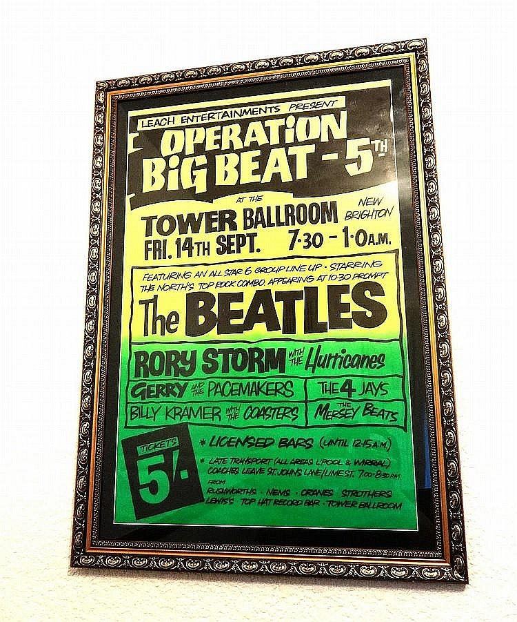 OPERATION BIG BEAT POSTER: Fluorescent green and yellow size 30x21 inches.During the days of the burgeoning Liverpool Sound the venue began to be used for a series of spectacular dance promotions, the first beginning on 10 November 1961 under the name 'Operation Big Beat.' The show opened at 7.30pm and the Beatles appeared at 8pm. They then fulfilled another engagement at Knotty Ash Village Hall before returning for their second Tower appearance that evening at 11.30pm. Tickets for the event had been sold for weeks in advance at NEMS Whitechapel store, which was managed by Brian Epstein. Epstein had been aware of their existence for months and this was yet another example to disprove his disingenuous claim that he only heard about them when a boy walked into his store on 28 October. The first Operation Big Beat event drew an audience of 3,000 people. The groups appearing were the Beatles, Rory Storm & the Hurricanes, Gerry & the Pacemakers, the Remo Four, Earl Preston & the Tempest Tornadoes and Faron's Flamingos. Late night transport had to be arranged with the various local authorities as the event took place between 7.30pm and 2.00am. Tickets cost 6/- (30p). An added treat for the audience was the appearance of Emile Ford, who'd had several hits, including 'What Do You Want To Make Those Eyes At Me For?' and 'Slow Boat to China.' He got up on stage and sang with Rory Storm & the Hurricanes while American singer Davy Jones joined the Beatles on stage and sang two numbers with them. The Beatles returned to top the bill again on 1 December 1961 at a six-group extravaganza which attracted 2,000 people. THE POSTER HAS BEEN MOUNTED BEHIND AN ITALAIN HARDWOOD FRAME, AND IS IN GOOD CONDITION. THE POSTER LOOKS LIKE IT IS ON THIN PAPER, AND IS THE CORRECT SIZE FOR THE ORIGINAL POSTER. WE DON'T KNOW IF THIS IS AN ORIGINAL OR A REPRODUCTION, SO PLEASE BID BASED ON THIS INFORMATION.