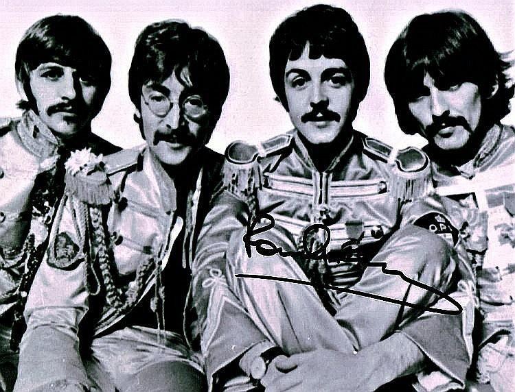A modern print of The Beatles from 'Sgt Pepper's' signed by Paul McCartney in black sharpie. Condition Report: Very good. Provenance: Supplied with coa. Dimensions: 9.5 x 7.5 inches.