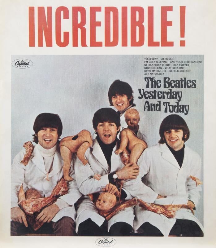 A vintage promotional poster for The Beatles 1966 album Yesterday and Today featuring the scandalous and soon-to-be-withdrawn Butcher Cover artwork that depicted the band covered in chopped meat and dismembered dolls.