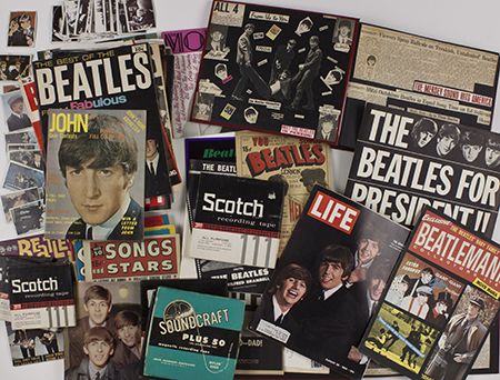 A large lot of ephemera from an avid Beatles collector, 8 reel-to-reel tapes (not played by us), 20+ fan magazines from the 1960s such as Songs and Stars, Song Hits Magazine, Hit Parader, Teen Screen and more; several mainstream magazines such as Life featuring articles on the Beatles, two copies of "The Best of the Beatles" and other specially-produced commemorative magazines with lyrics and so forth; many Beatles movie cards, a "Beatles for President" poster, 8" x 10" color candid photographs taken during concerts by more current musicians such as Cheap Trick, Keith Richards, The Cars, and others; two scrapbooks chock full of newsclippings, and more. Should be viewed.