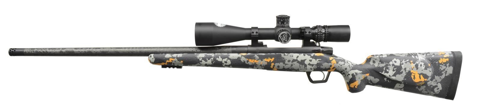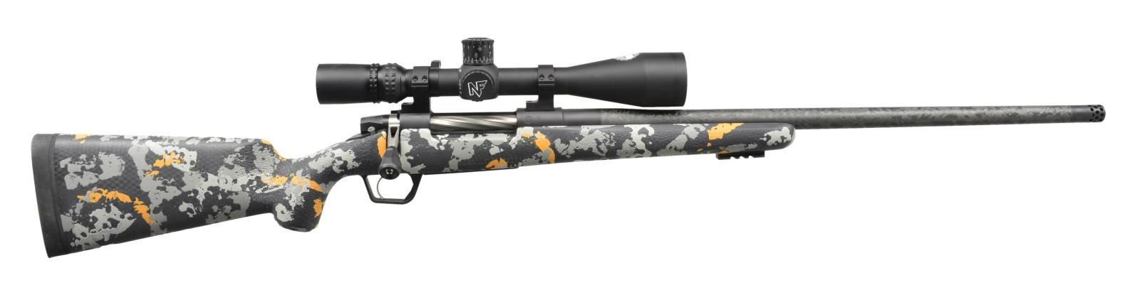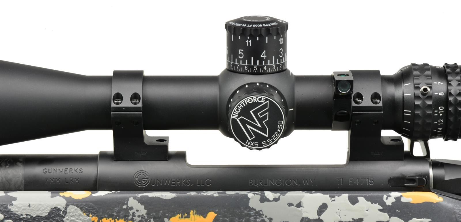 1000 LONG RANGE LIGHTWEIGHT HUNTING RIFLE WITH TITANIUM ACTION, CARBON BARREL, NIGHTFORCE SCOPE, AND G 7 RANGE FINDER IN CASE. Cal. 7 mm LRM. S# E4715. The ultimate for the long range hunter. This rifle features 25” carbon fiber wrapped stainless steel bbl. fitted w/ muzzle brake. Lightweight titanium action has one piece machined bolt w/ safety at right side. Marked “Gunwerks, LLC BURLINGTON, WY TI E4715” on left side. Right side is marked “G L R”. Lightweight bottom metal combines a special bedding system for extreme accuracy. Carbon fiber stock is finished in mountain camouflage gray & orange & measures 13 3/4” over black Decelerator pad. Bottom of forend has slotted rail for attachment of bi-pod (not included). Rifle is mounted w/ Nightforce NXS 5.5 – 22X scope w/ ranging reticle & spirit level. This scope is part of the LR shooting system package. Scope has been custom calibrated & includes the G 7 BR 2 ballistic range finder which takes into account range, temperature, atmospheric pressure & wind for setting reticle of scope. WEIGHT: 8 lbs. 14 oz. UNATTACHED ACCESSORIES: entire package is housed in Pelican type plastic case marked “Gunwerks” containing muzzle cap to replace muzzle brake & other parts of the system. Also included is a CD entitled “Long Range Pursuit”, catalogs & shipping invoice. 4 Boxes of Gunwerks hand crafted 7mm LRM ammo w/ 180 grain hybrid bullets. CONDITION: exceptionally fine, very close to “as new” w/ evidence of having only been fired a few times. Scope is excellent. Case is new. (20-618/MGM88). MODERN. $9,5000-14,000.